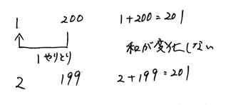 1枚目から3枚目まで書き込むと、図の左に並ぶ数字は1から1ずつ増えていきます。右に並ぶ数字は200から1ずつ減っていきます。左側に並ぶ数字は200の半分の100までです。