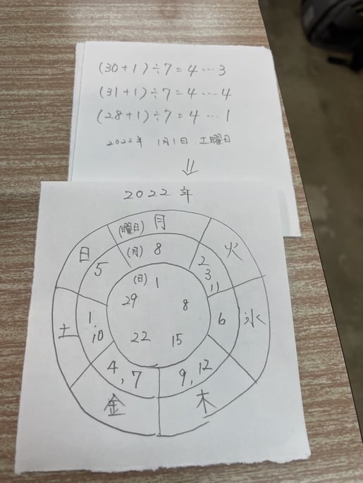 どういう理屈で書いてあるかというと、カレンダーの上にある計算式で考えています。1月1日土曜日ならば、2月1日は31+1日目なので32÷7=4あまり4。あまりの4より、周期(土、日、月、火、水、木、金)の4番目なので2月1日は火曜日です。その結果、火曜の欄に2と書かれているわけです。「暦算」を使っているわけですね。